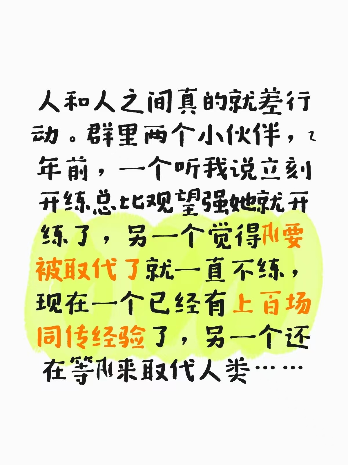 人和人之间真的就差行动。群里两个小伙伴,2年前,一个听我说立刻开练总比观望强她就开练了,另一个觉得AI要被取代了就一直不练,现在一个已经有上百场同传经验了,另一个还在等AI来取代人类……