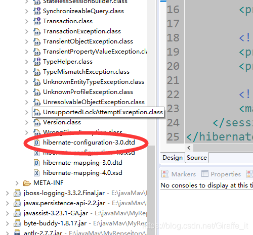 打开圆圈中的那个文件,将上面画红线的代码块的约束粘贴到 hibernate.conf.xml中