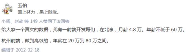 前端大神玉伯就曾透露,他的一位前端开发哥们在北京月薪已达4.8万,年薪不低于60万元。他还表示,在杭州前端高级技术岗年薪已在20万至80万之间。而这还是发生在2012年,也就是5年之前。