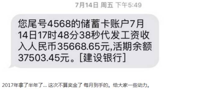 还有一位自称北京二流互联网公司的前端开发者也晒出了自己的工资。请注意,是税后35668.65元,这还没有包含当月的奖金。