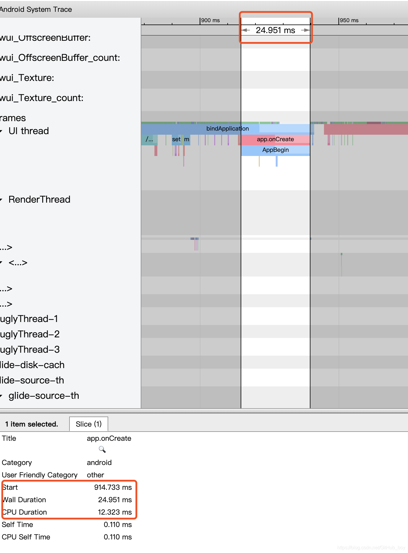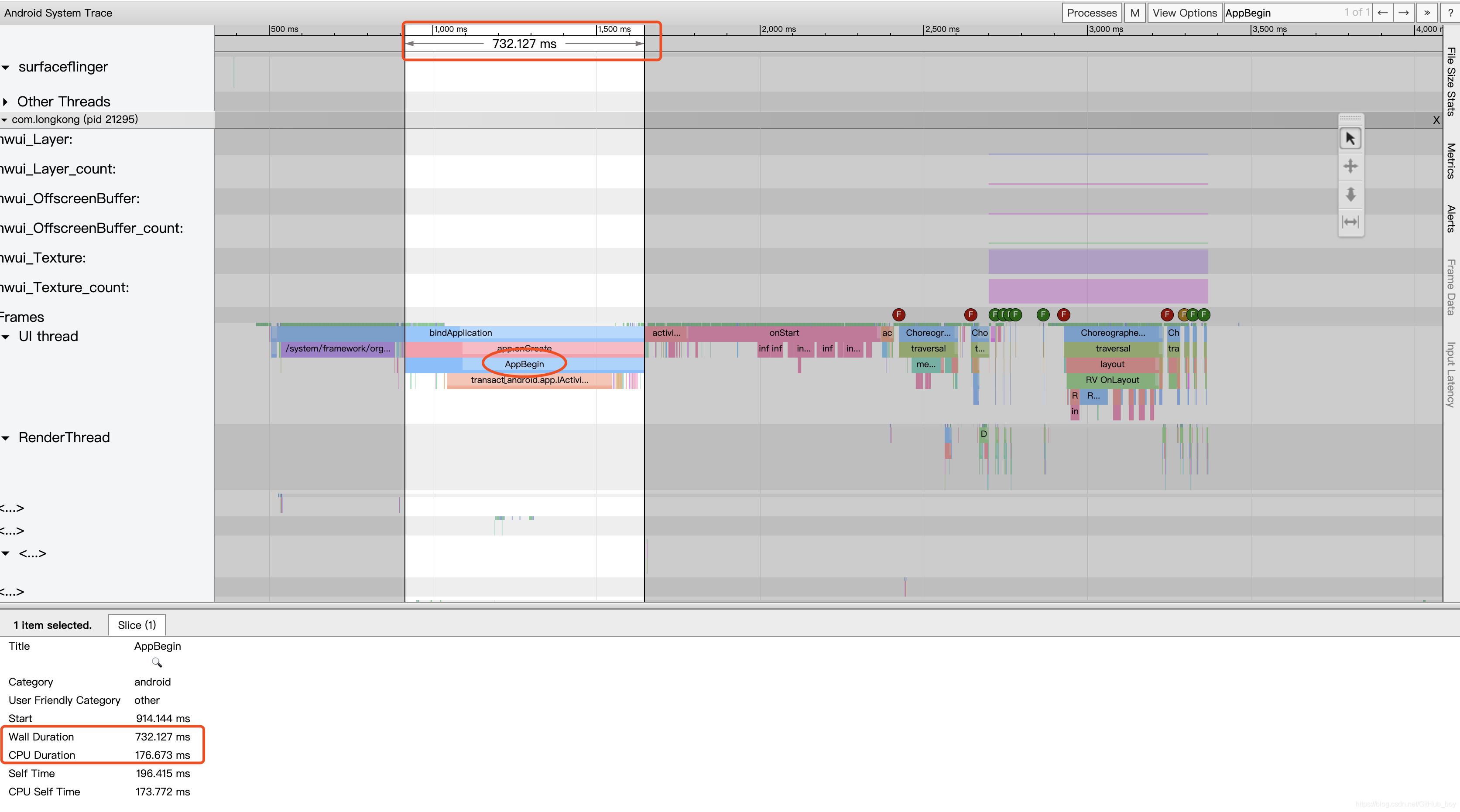 图中红圈部分是我们需要注意的地方,AppBegin就是我们打点的代表区间,可以看到这段区间时间是732.127毫秒。最下面有两个数值,一个是WallDuration,这个就是我们代码的执行时间,另一个CPUDuration是我们的CPU执行时间。