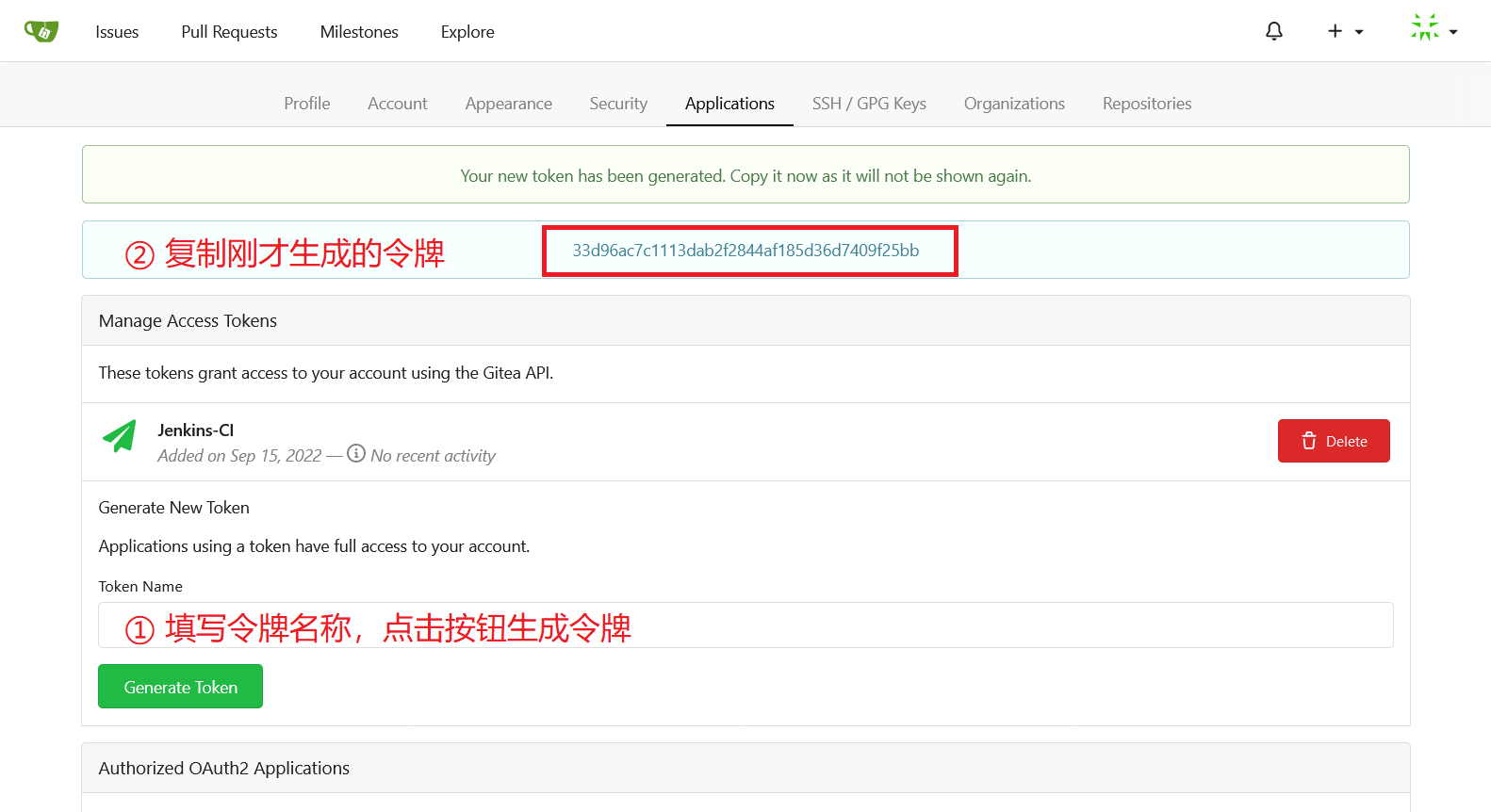 - 在 Gitea 注册用户 Jenkins,同时为用户 Jenkins 添加 API Access Token,用于 Jenkins 从 Gitea 拉取代码