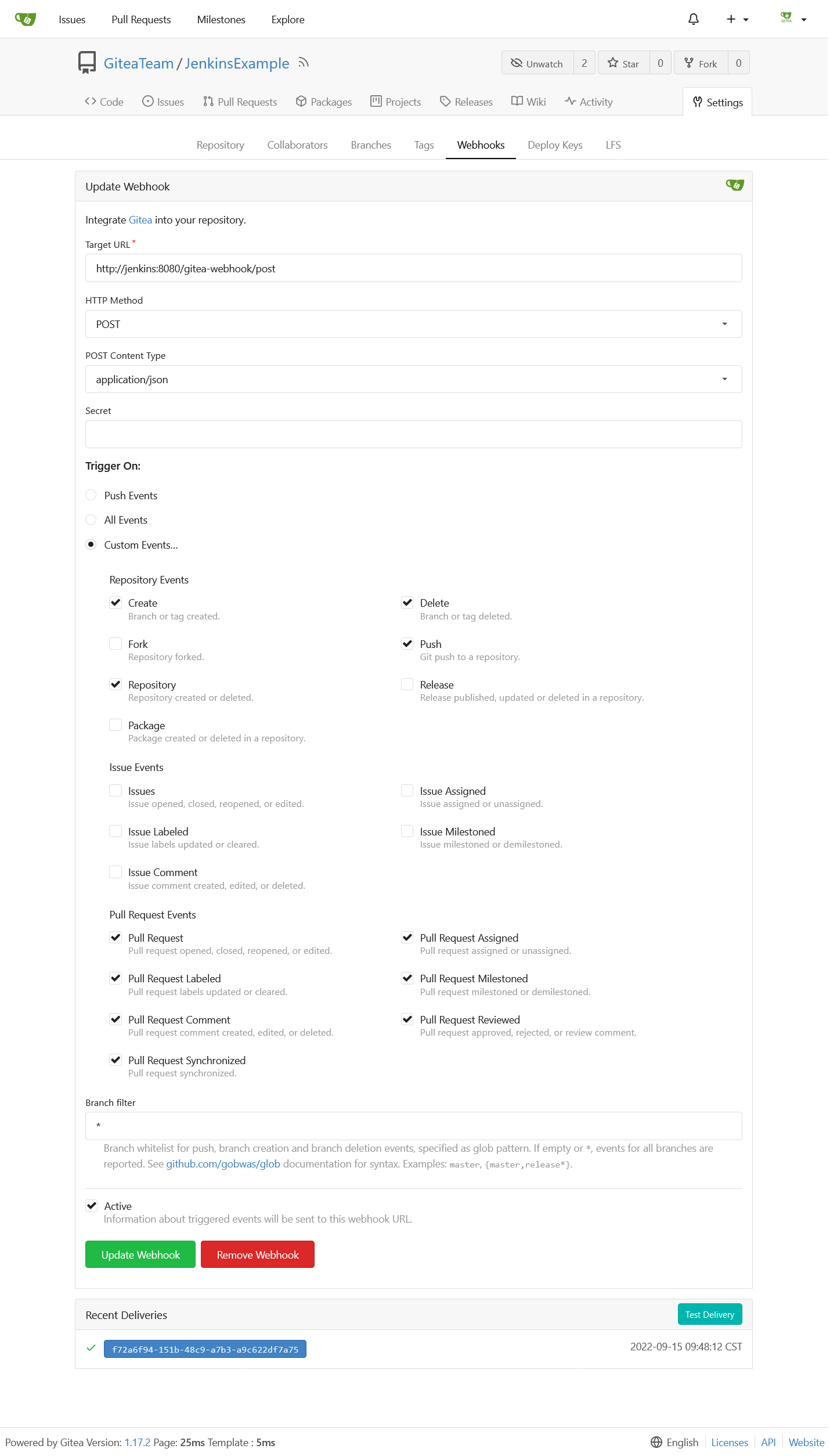 检查 Gitea Plugin 自动为 Gitea 创建的 Webhook: