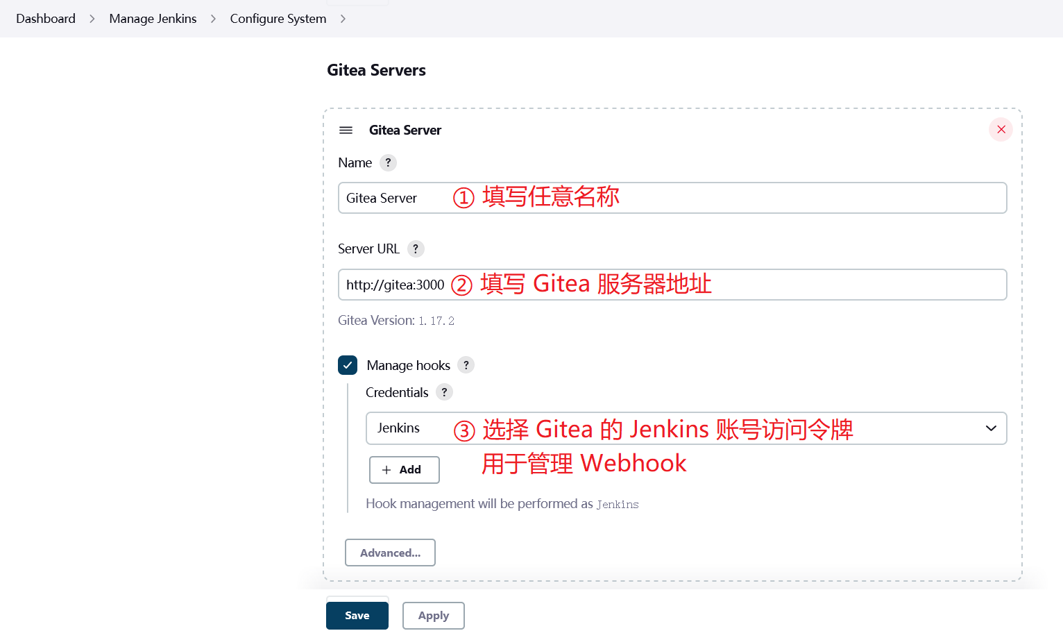 - 打开 Configure System 配置 Gitea Server 插件,填写 Gitea 服务器地址和 Mange Hooks 令牌(选用上一步填写的 Credentials)
