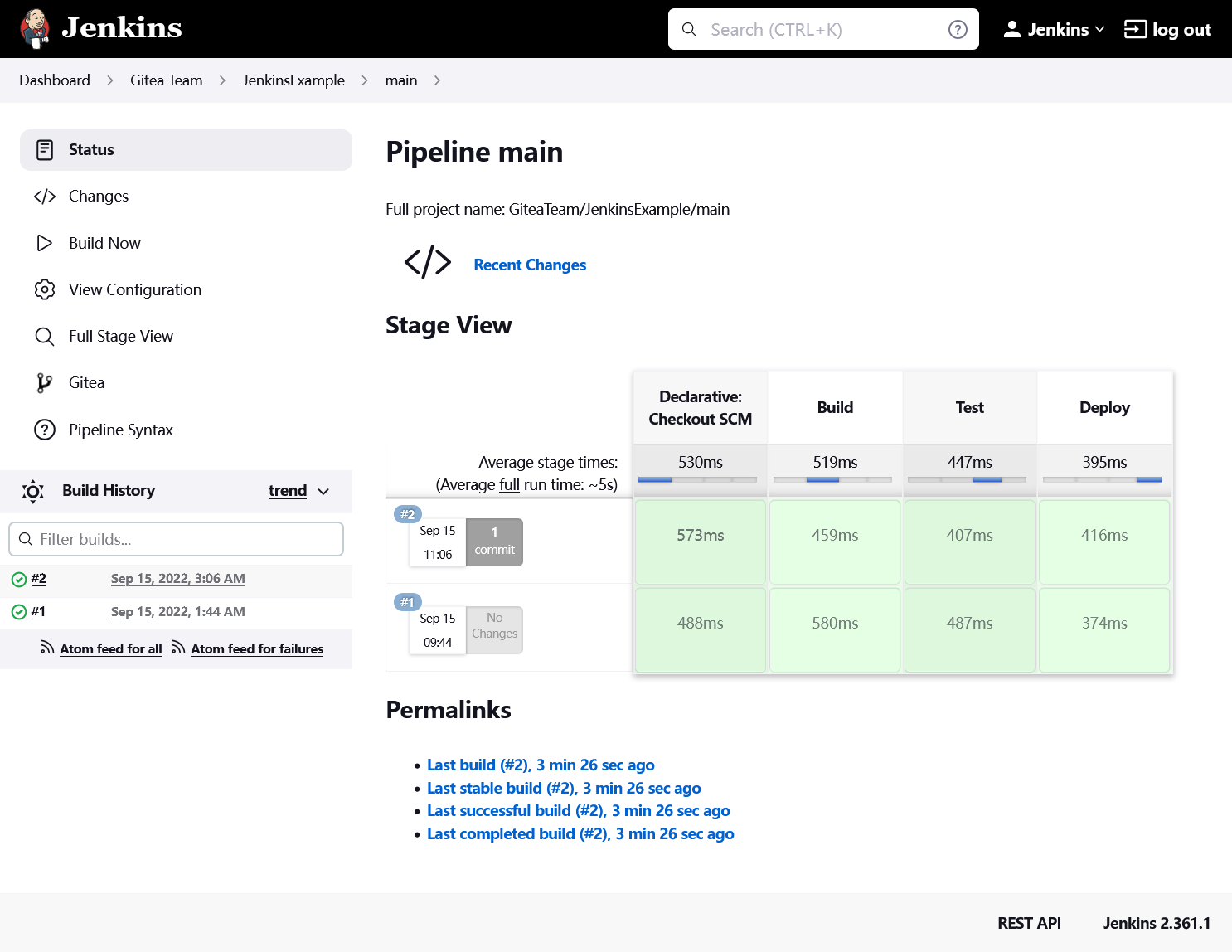 在上面的集成配置中,我们为 Gitea 服务器上的 GiteaTeam 组织集成了 Jenkins CI 能力。于是,当用户在 GiteaTeam 组织中创建包含 Jenkinsfile 的代码仓库时, Jenkins CI 也将自动启动,为 Gitea 配置 Webhook。当用户再次提交代码到 Gitea 服务器时,Jenkins 就能被 Gitea Webhook 触发构建过程。