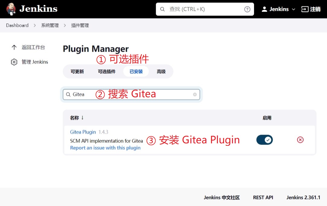 在 Jenkins 依次打开 系统管理 - 插件管理,在 可选插件 中搜索并安装 Gitea。