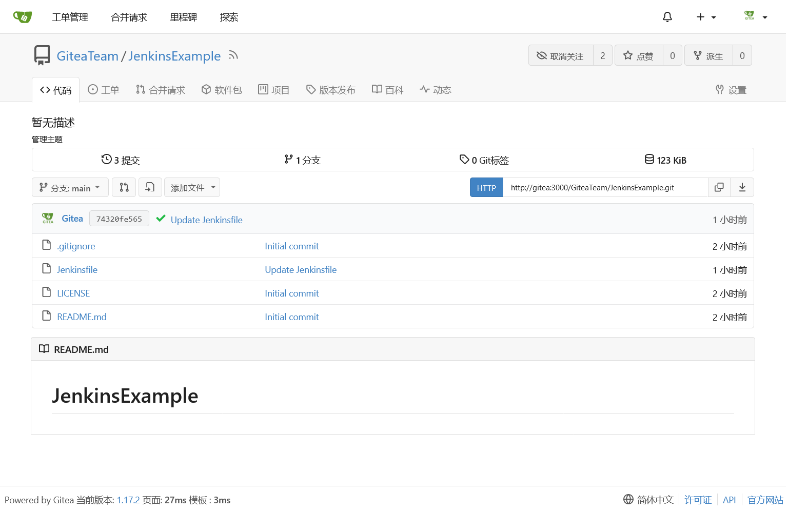 JenkinsExample 项目中仅包含一个有效的 Jenkinsfile 示例文件,用于演示 Jenkins CI 与 Gitea 的集成。
