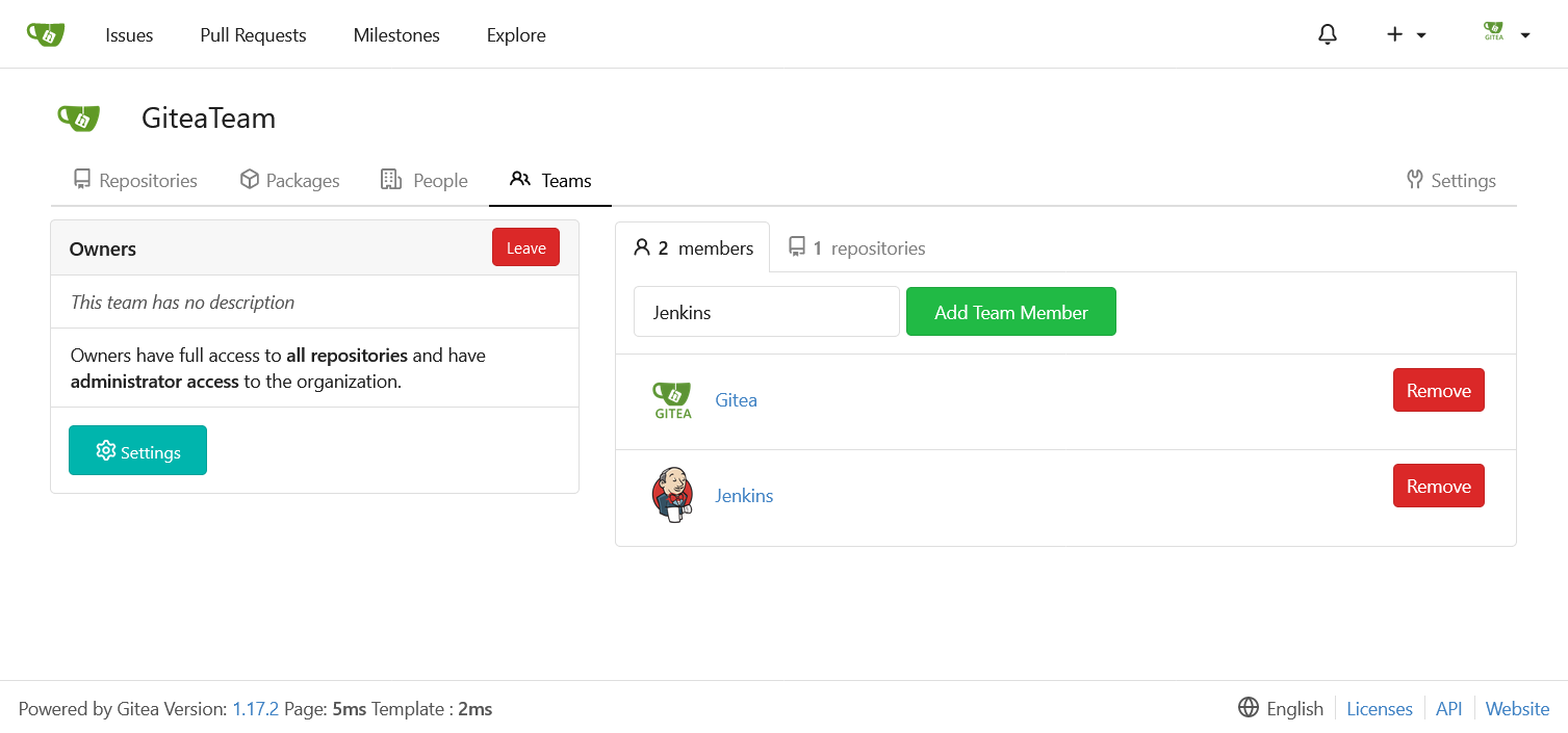 - 在 Gitea 中创建组织 GiteaTeam,并且将 Jenkins 用户添加为组织管理员