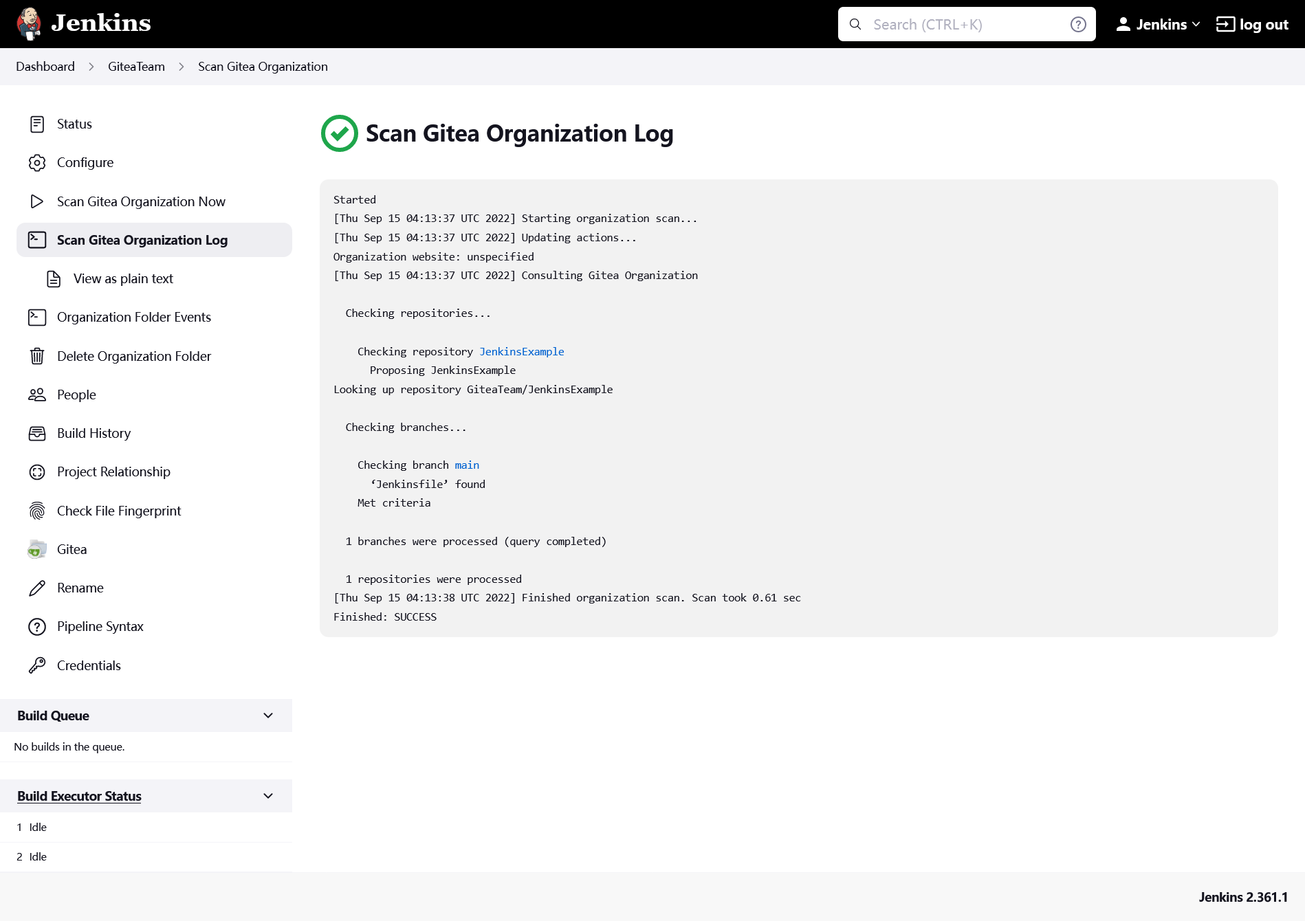 稍后,Jenkins 就会开始扫描 Gitea 服务器上的 GiteaTeam 组织,在 Scan Gitea Organization Log 呈现出扫描结果: