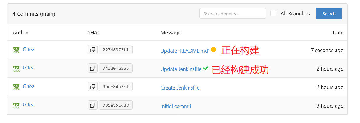- 在 Gitea 的提交列表中,我们可以观察到当前代码提交的构建情况,黄色的 ● 表示正在进行构建任务,绿色的 ✔ 表示已经完成的构建任务。