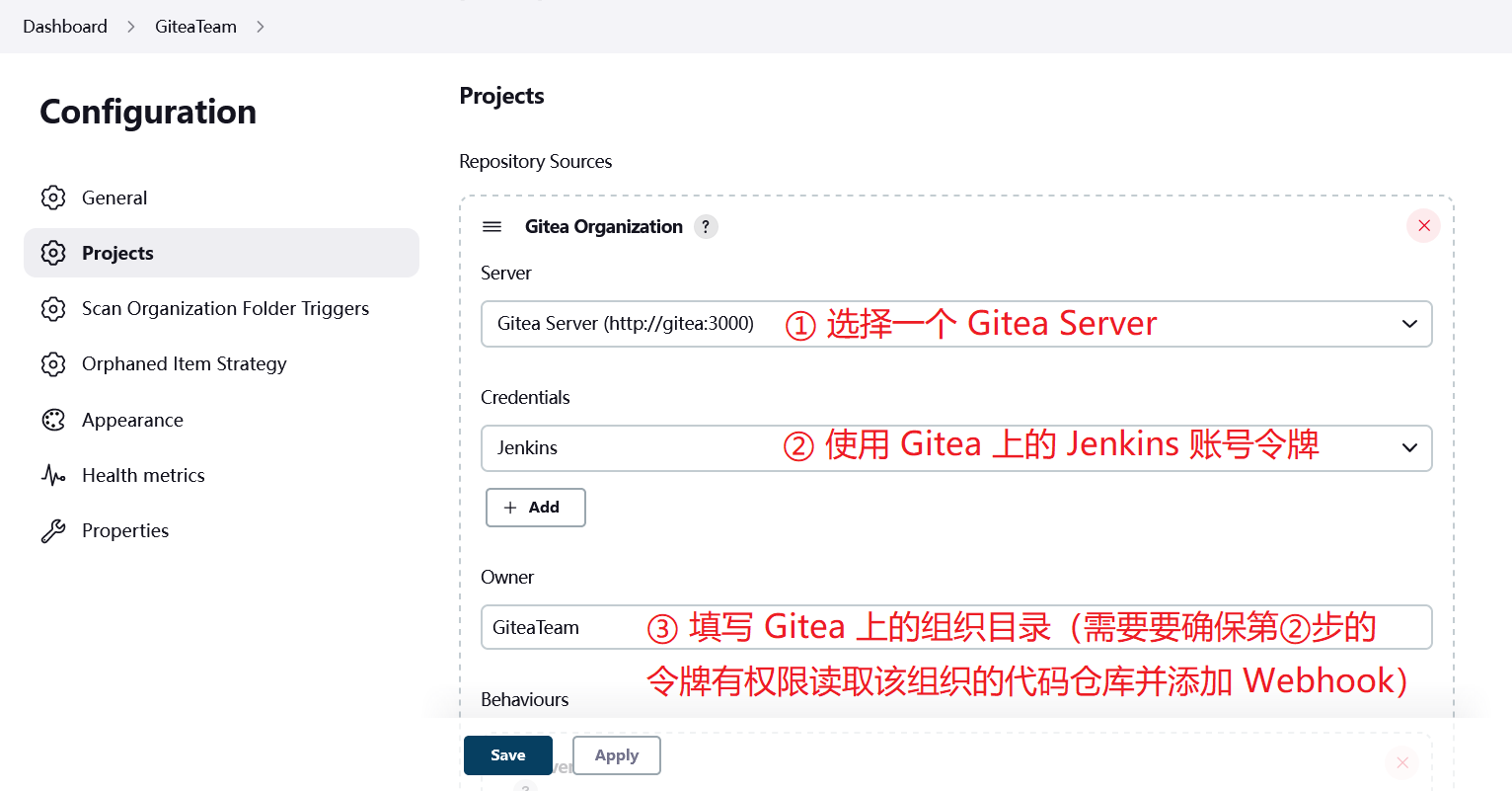 打开刚才创建的 Organization Folder。在 Projects - Repository Sources 中添加 Gitea Organization 并填写: