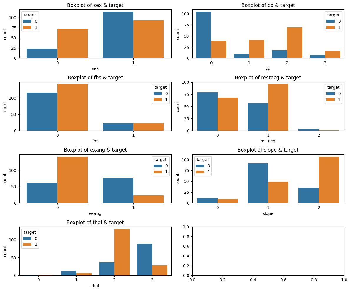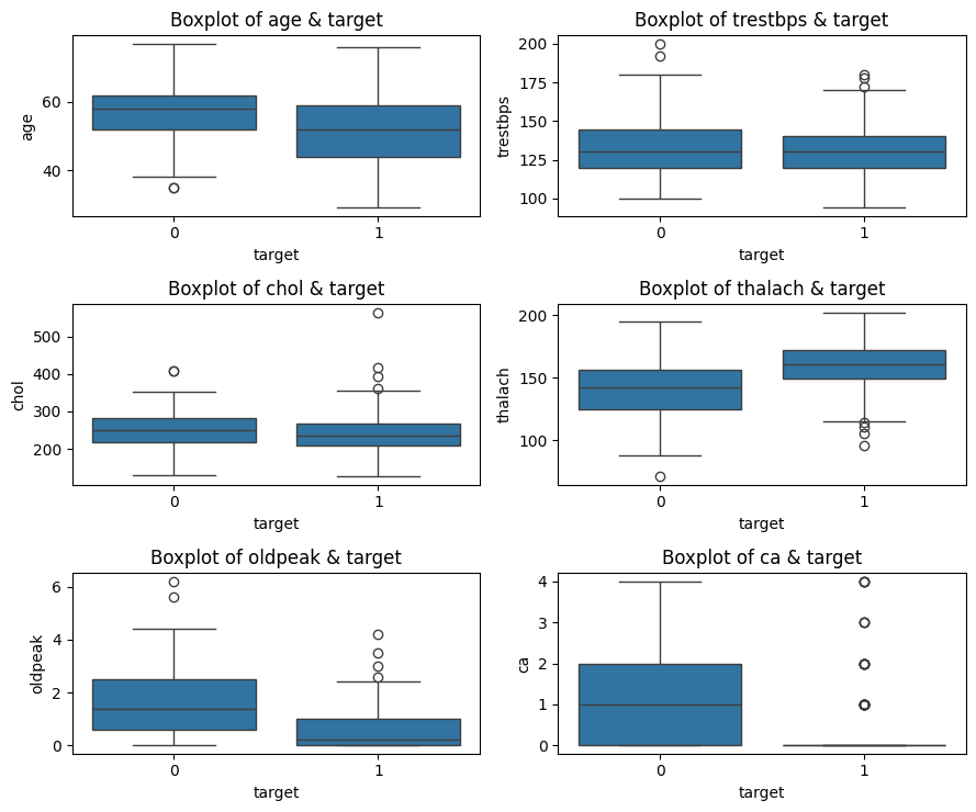 采用箱线图展示标签与数值型特征的关系,可以看到患有心脏病和健康人群的该特征中位数、分布范围的差异以及异常值的情况。