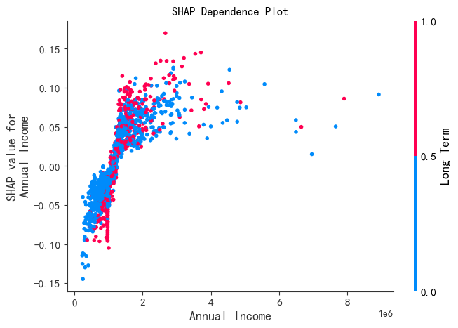 # 也可以指定特征名称,例如:shap.dependence_plot("Loan Amount", shap_values[:, :, 0], X_test, show=False)