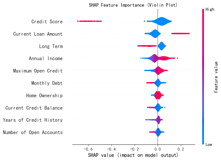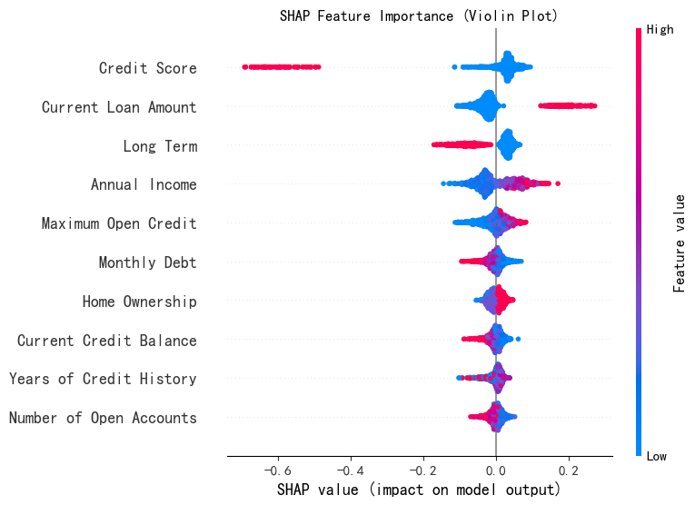 查看SHAP值的详细分布,是Dot图的平滑聚合,展示了SHAP值的概率密度分布。形状的宽度表示在特定SHAP值范围内样本的密度。一般,使用violin图。