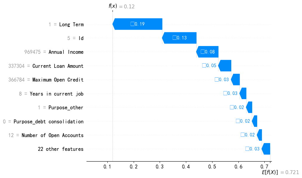 瀑布图以阶梯式的方式,一步步展示每个特征如何将模型的预测值从基准值(所有训练样本预测的平均值)推动到最终的预测值,不适合多样本比较。