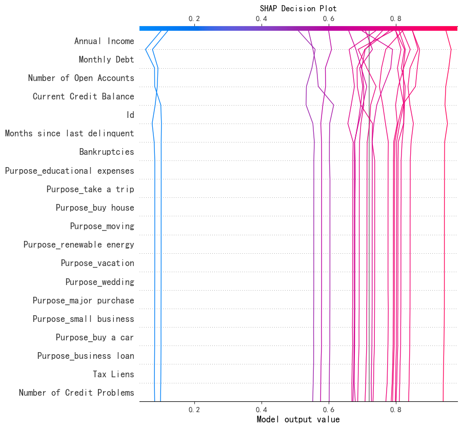 决策图展示了对于一个或多个样本,各个特征是如何通过其SHAP值累积起来,最终形成模型预测值的。可以看作force_plot的’纵向‘版本,适合同时分析和比较多个样本。