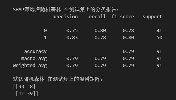 print("\nSHAP筛选后随机森林 在测试集上的分类报告:")