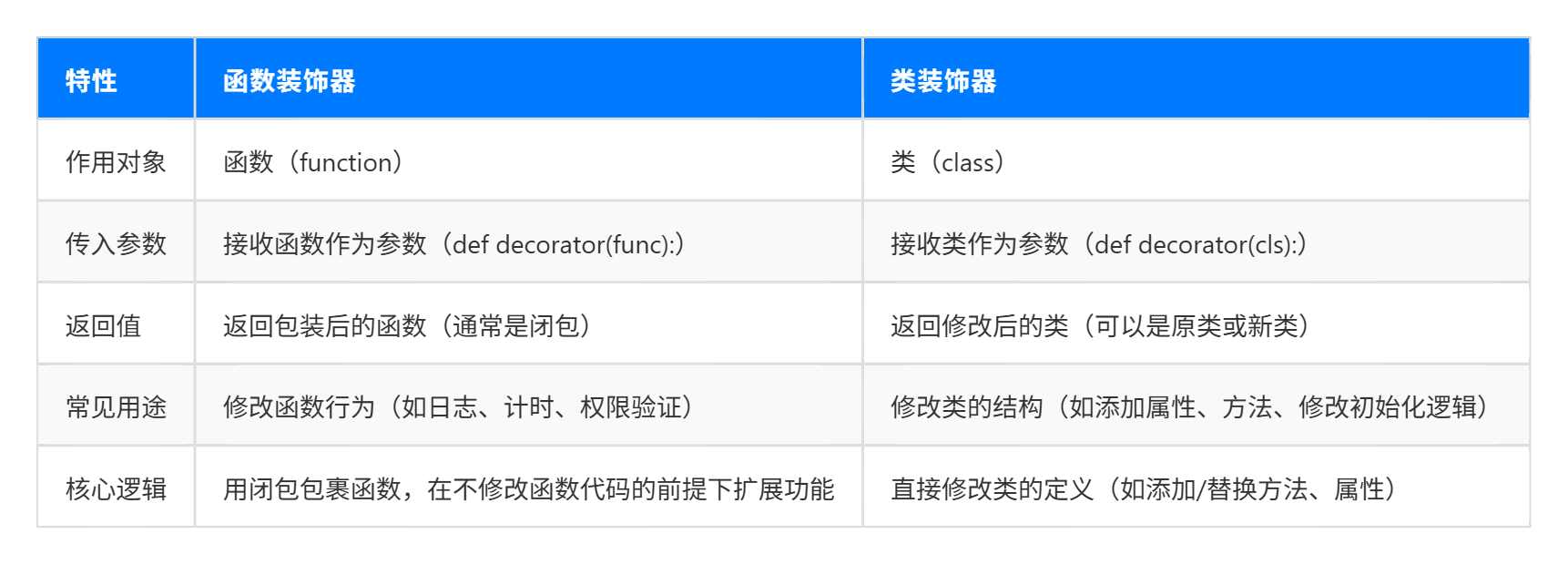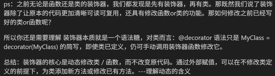 与函数的装饰器类似,类的装饰器本质上也是一个函数。它接收一个类作为参数,并返回一个修改过的类(或一个新类),从而实现在不修改原始类的代码的情况下,在外部为类增加额外的功能。