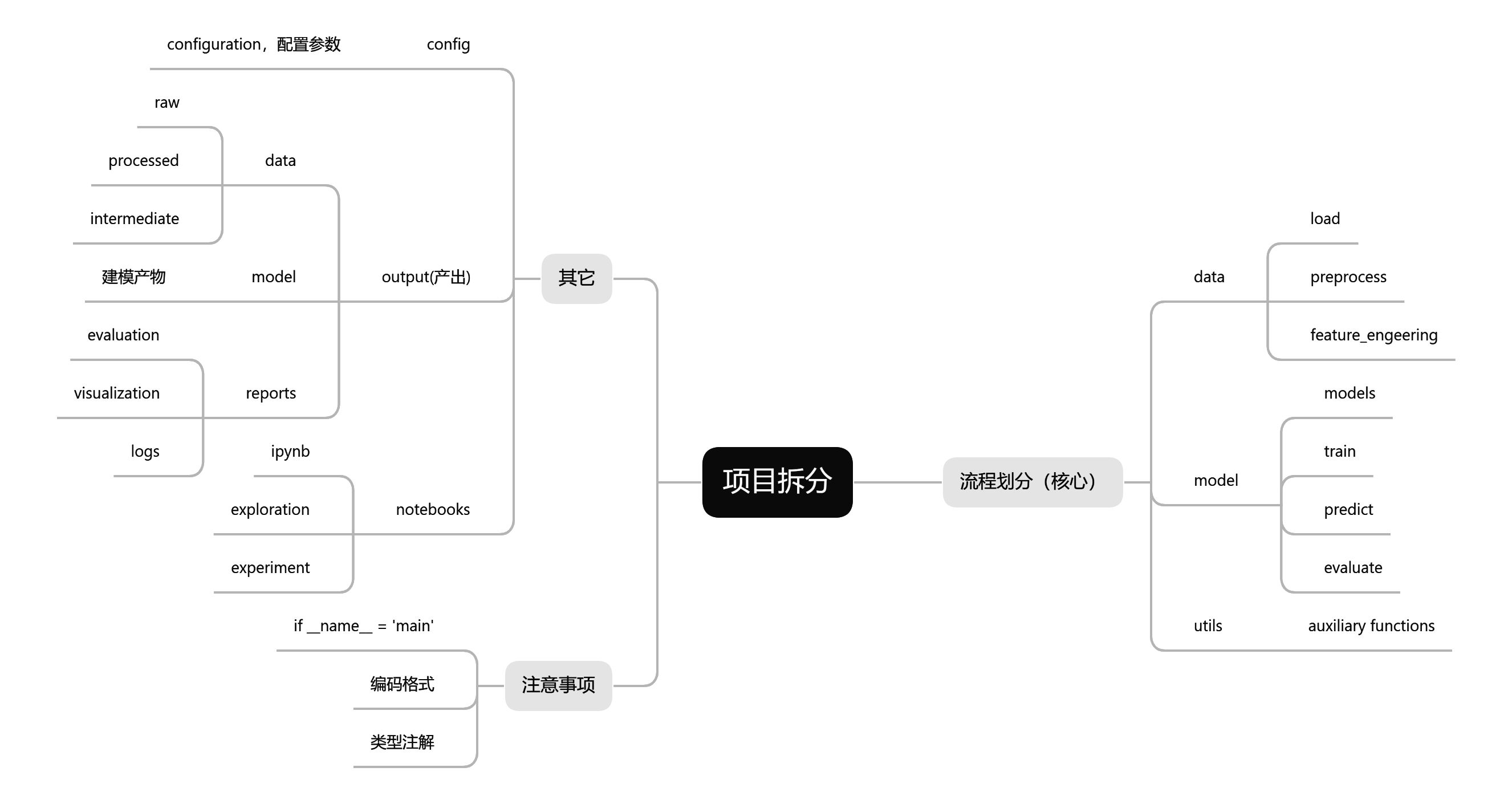 将一个机器学习项目文件进行拆分时,主要遵循以下步骤:(1)将主要流程拆分到py文件中(数据处理、训练等)(核心)(2)通用的辅助函数放入utils.py中(3)所有配置参数放入config.py中(4)产出物的存放