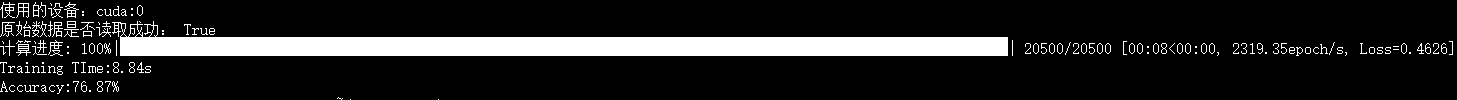 隐藏层大小为62,epoch数值为20500,优化器为SGD,用时10.32 s,准确率:76.93%