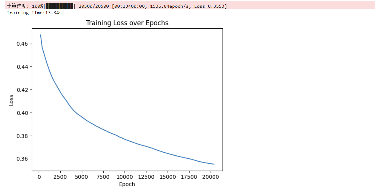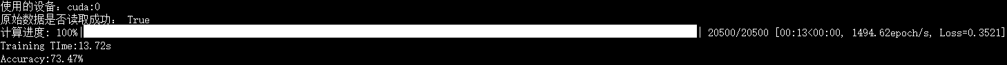隐藏层大小为62,epoch数值为20500,优化器为Adam,用时13.34 s,准确率:73.87%