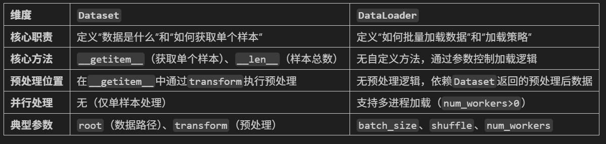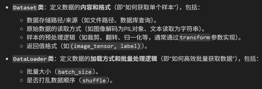 (1)Dataset:负责封装数据及其标签,提供按索引访问样本的能力,