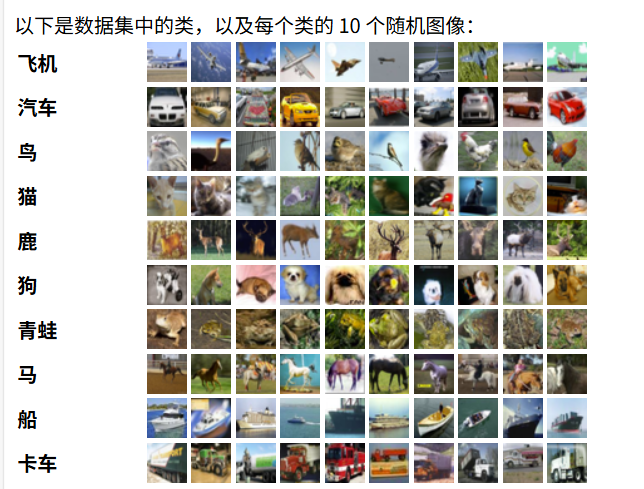 CIFAR-10 数据集由 10 类的 60000 张 32x32 彩色图像组成,每类 6000 张图像。有 50000 张训练图像和 10000 张测试图像。