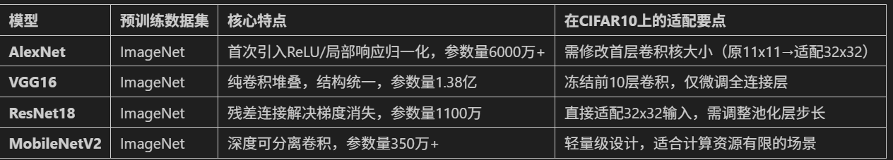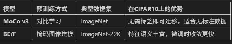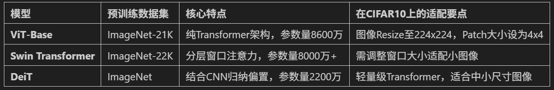 (2)Transformer类:适用于较大尺寸图像(如224x224),在CIFAR10上需上采样图像尺寸或调整Patch大小。如ViT-Base、Swin Transformer、DeiT。
