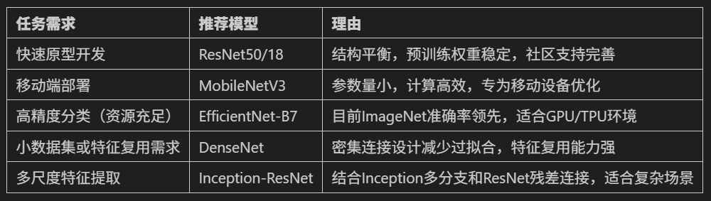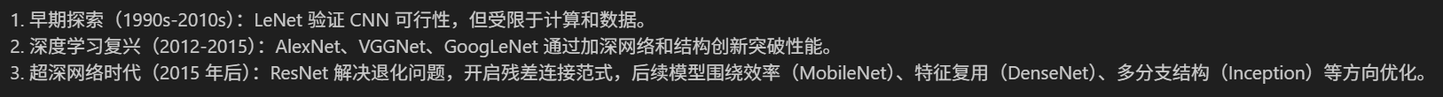 - 计算效率:GoogLeNet(Inception)和MobileNet通过结构优化,在保持精度的同时大幅降低参数量。