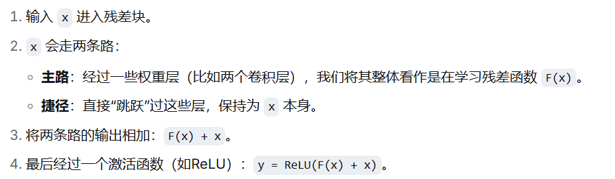 x本身。 - 然后主路和捷径两者相加:H(x)=F(x) + x,最后经过激活函数输出。