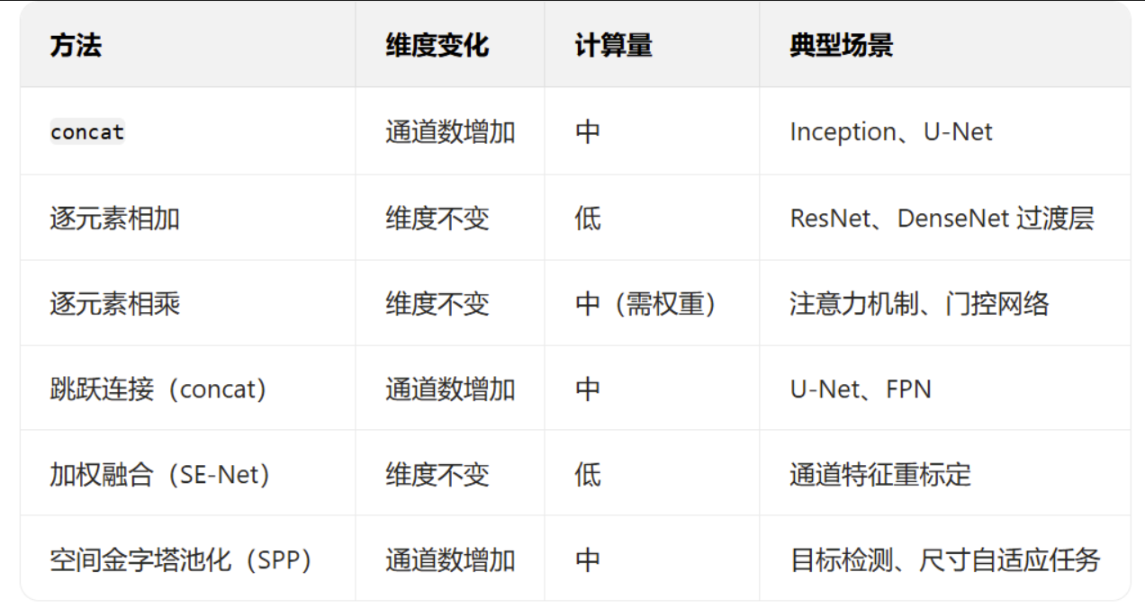 - 特征融合方法阶段性总结:逐元素相加或相册、concat通道数相加等