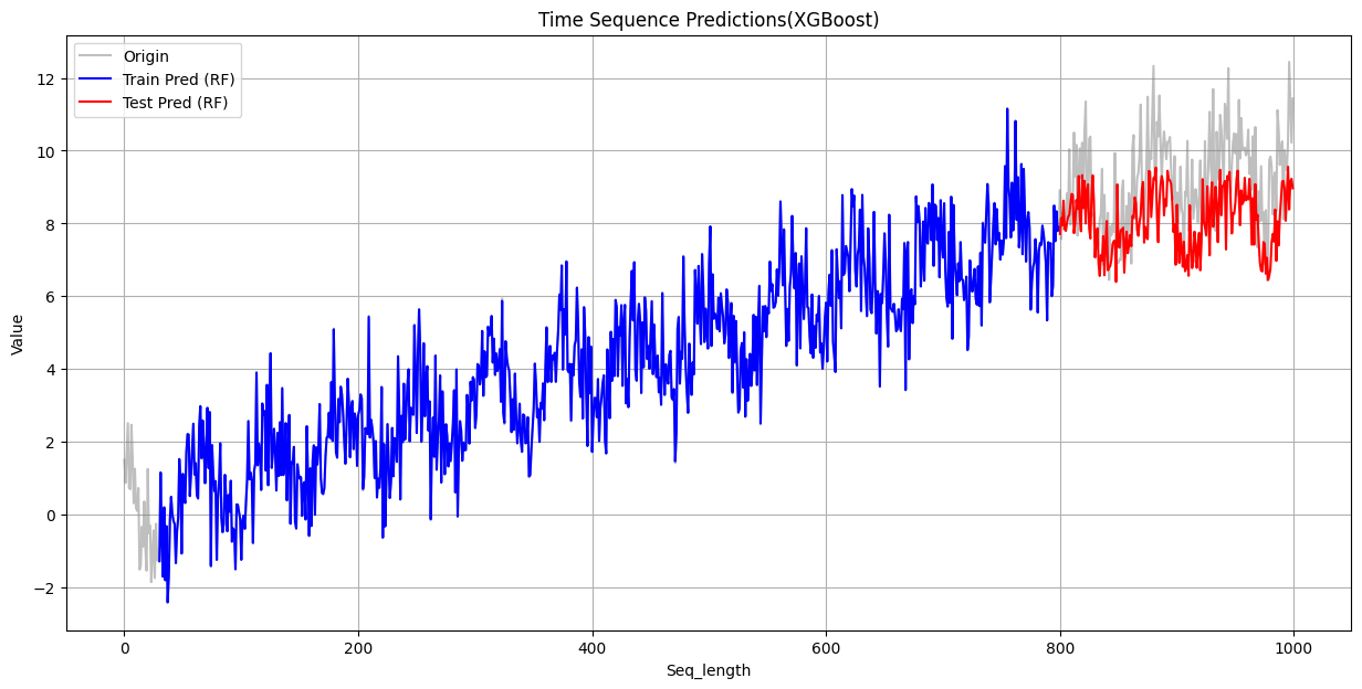 从上面可以看到,在训练集上,三个模型的表现都不错,其中XGBoost的误差最小,与原始数据重合度最高。但是在测试集上,三者的误差都比较大。