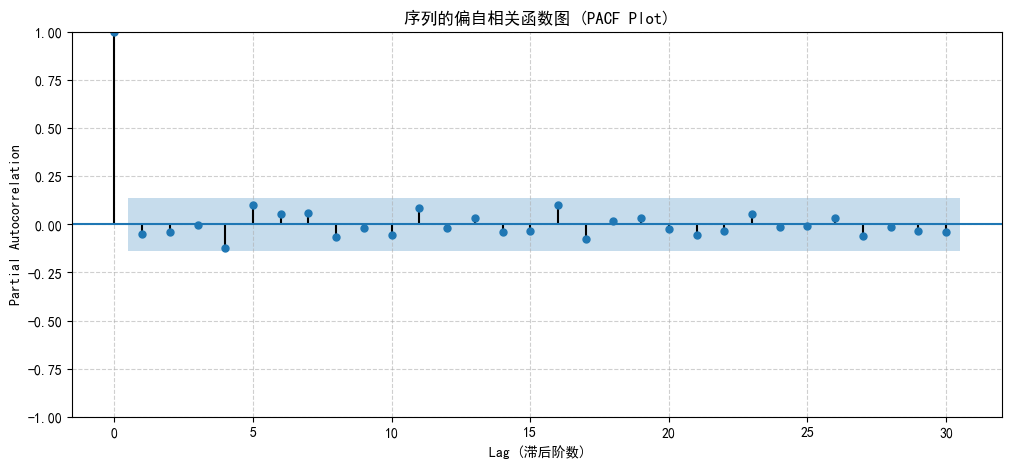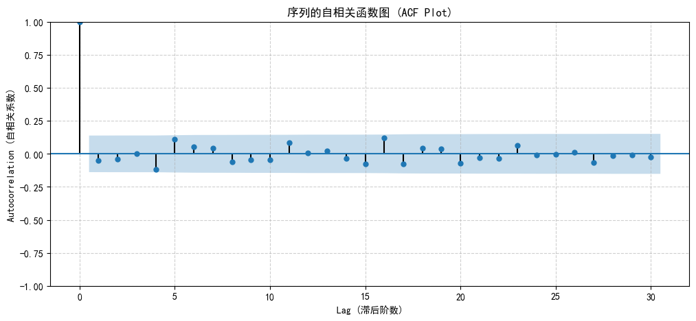 print(f"在滞后30阶时,p-value ({last_p_value:.4f}) 大于 0.05。")