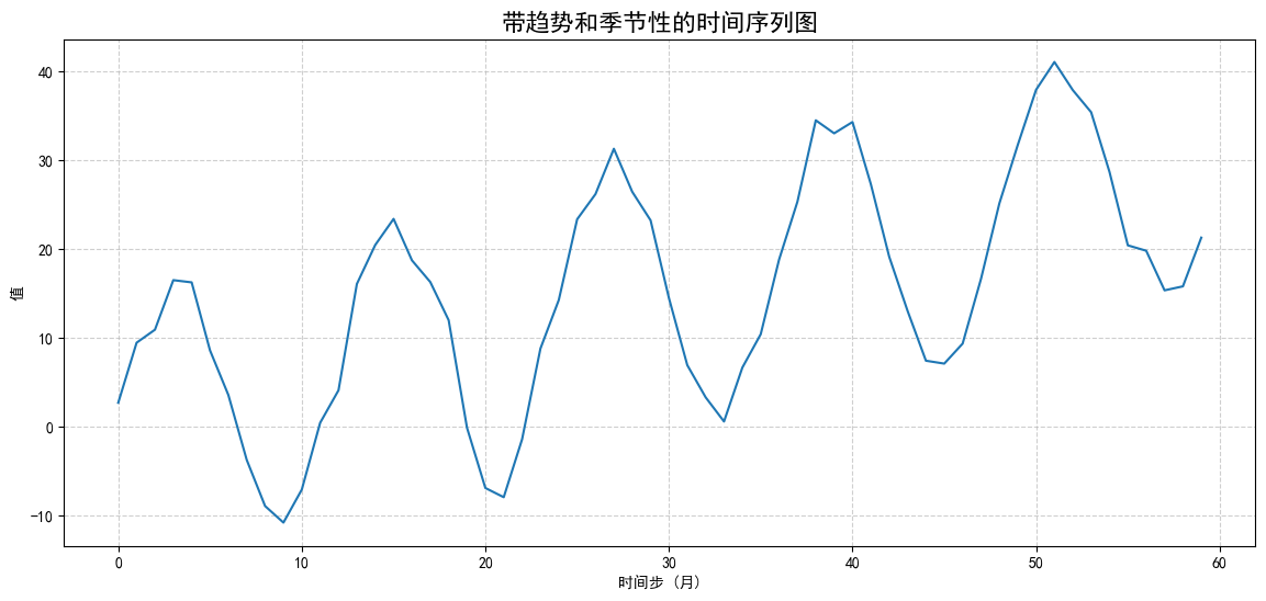 plt.title('带趋势和季节性的时间序列图', fontsize=16)