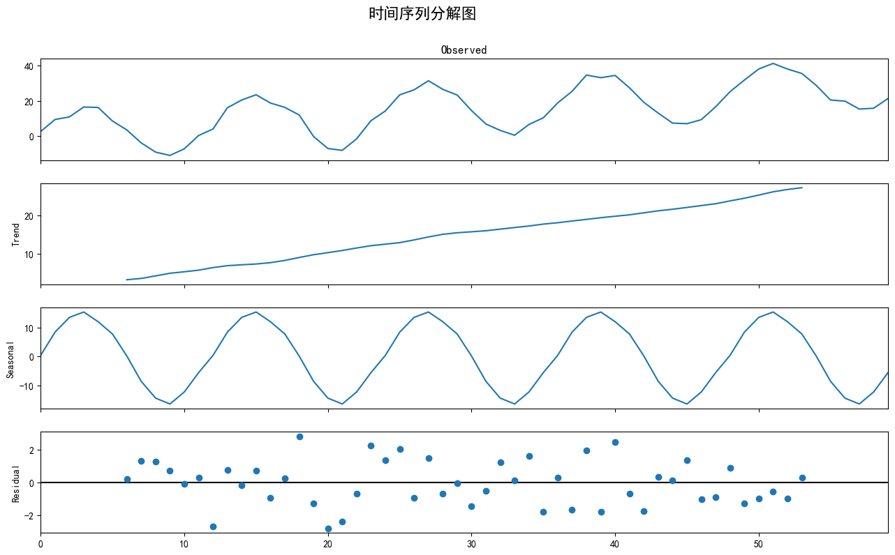 分解图清晰地将数据拆分成了趋势、季节性和残差。季节性部分呈现完美的年度周期,而残差看起来像随机噪声。