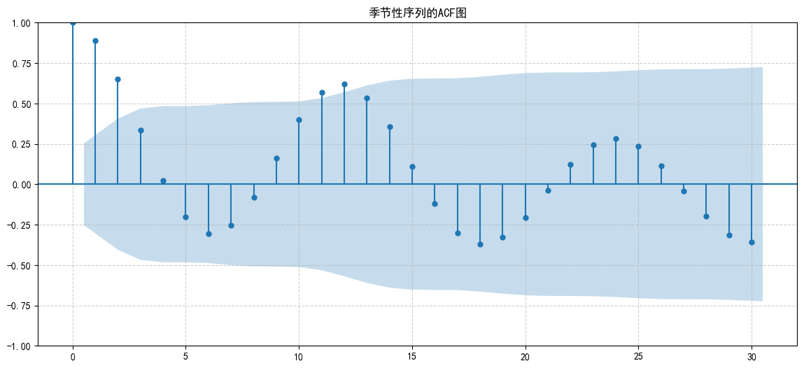 如果一个序列存在季节性,它的ACF图会呈现出非常独特的形态:在代表季节性周期的滞后点上出现显著的尖峰。对于月度数据(年度季节性,周期为12),在 lag=12, 24, 36, ... 的位置看到很高的相关性柱子。因为今年1月的数据和去年1月的数据高度相关,和前年1月的也相关。