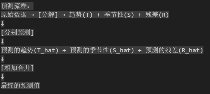 (1)先让“结构工程师”(分解模型)把宏观的、确定的趋势和季节性部分拿走。(2)然后,把剩下的、更接近平稳的、但仍然包含一些微弱信息的“残差”,交给“精装修师傅”(ARIMA)去处理。(3)最后,将两部分的工作成果合起来,得到最终的精美成品(预测结果)。