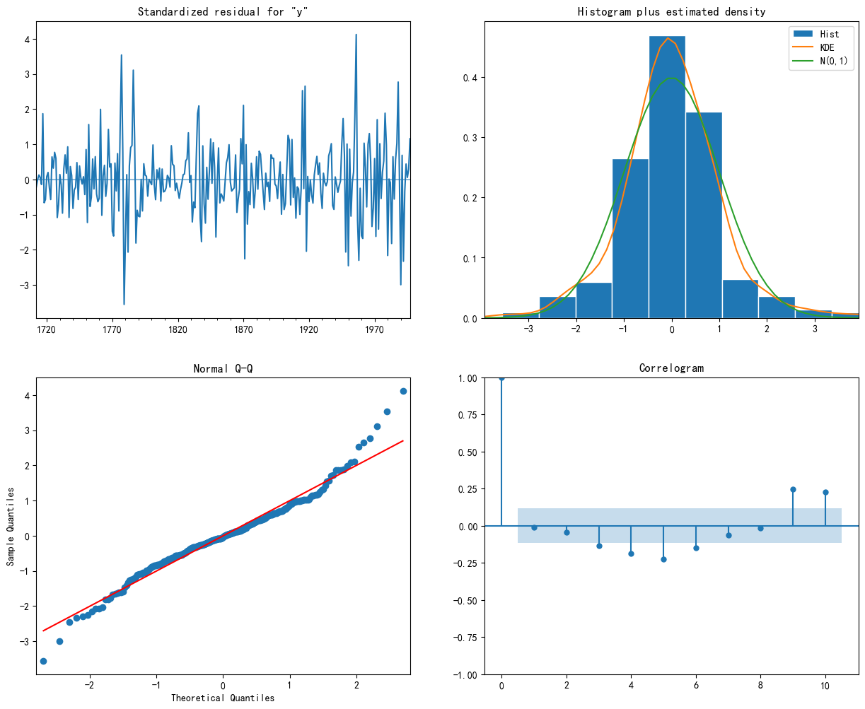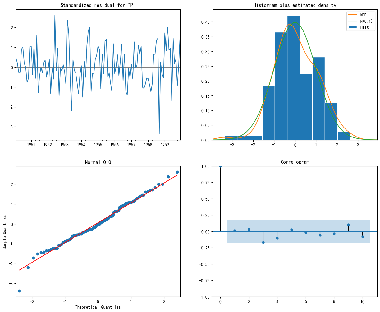 获取最优参数,拟合模型。然后绘制模型诊断图,检验残差是否满足白噪声的假设: