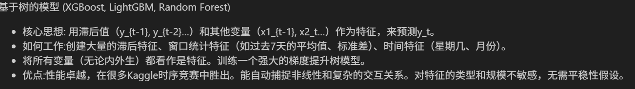 - 机器学习模型:将时序问题转换为监督问题,灵活性高,能处理复杂关系
