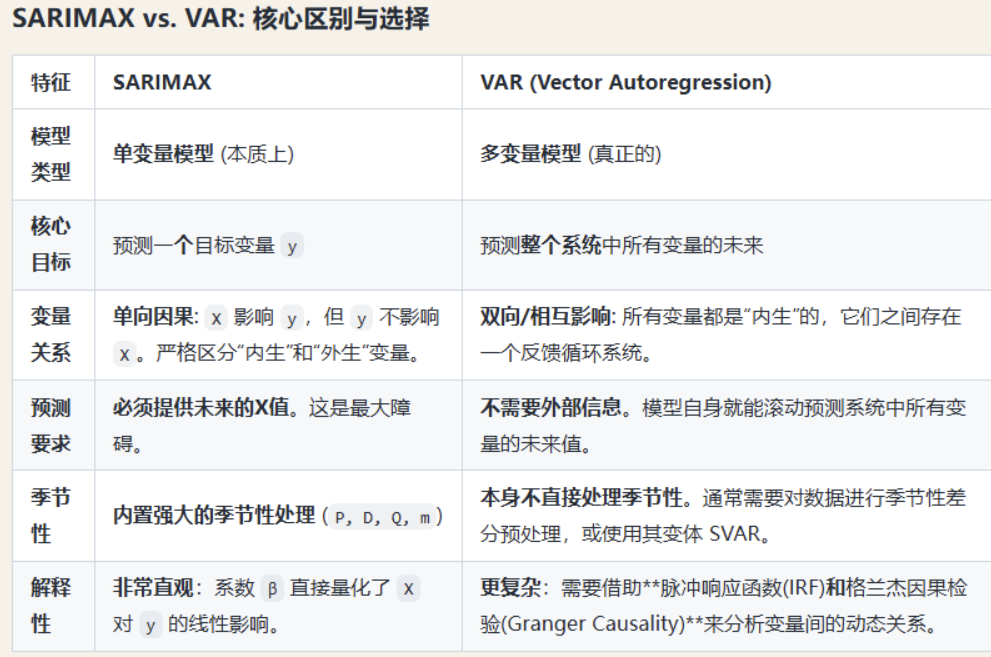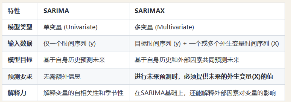 模型首先像SARIMA一样,分析目标序列 y 自身的历史模式(趋势、季节性等)。然后,它同时建立一个类似线性回归的模型,来评估外生变量 X 是如何影响 y 的。最终的预测结果是这两部分作用的结合。