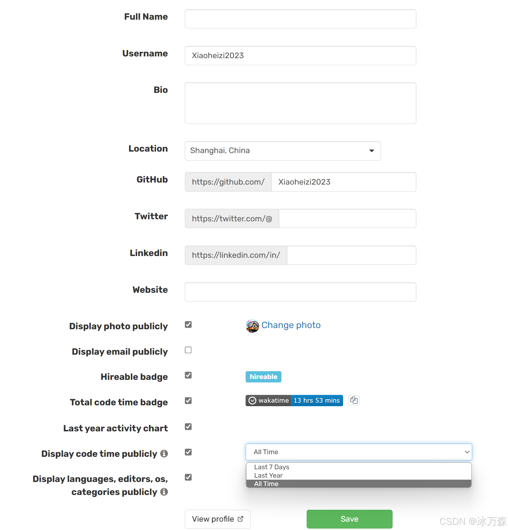 打开我的Wakatime,点个人头像➡Settings➡Edit profile,把需要公开的内容全部选择公开