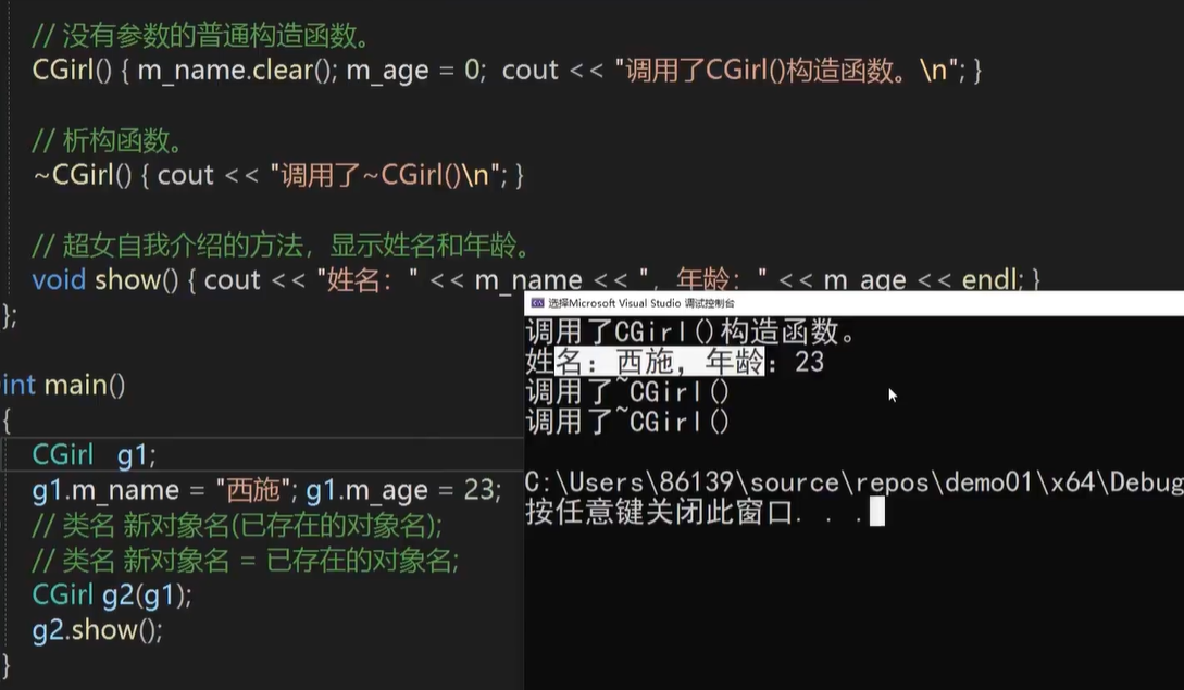 - 如果类的成员也是类,创建对象的时候,先构造成员类;销毁对象的时候,先析构成员类;