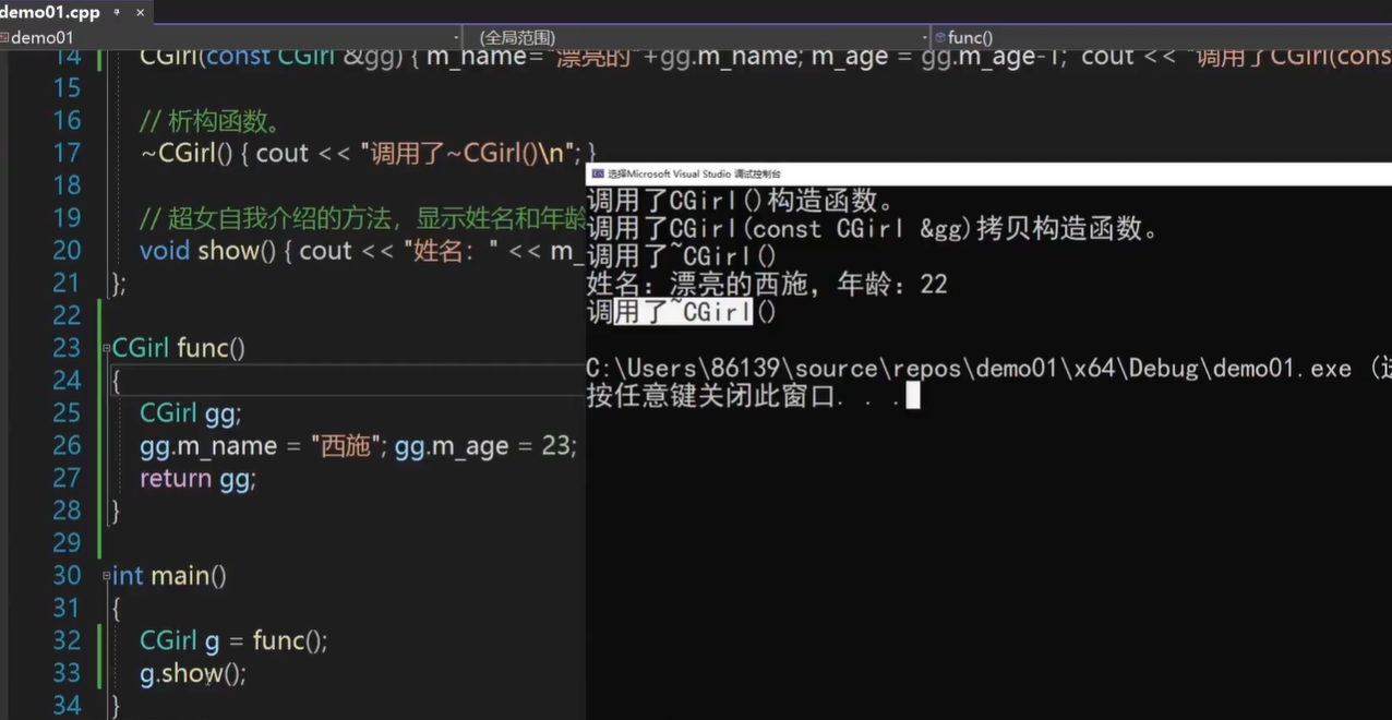 - 如果类中没有定义拷贝构造函数,编译器将提供一个拷贝构造函数,它的功能是把已存在对象的成员变量赋值给新对象的成员变量;