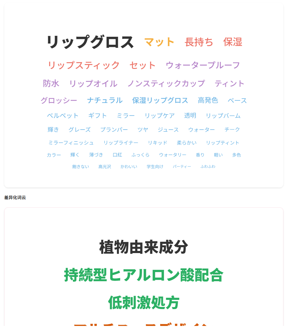 词云分析,分为共性词云与差异化词云,可放在商品名称中添加商品曝光率