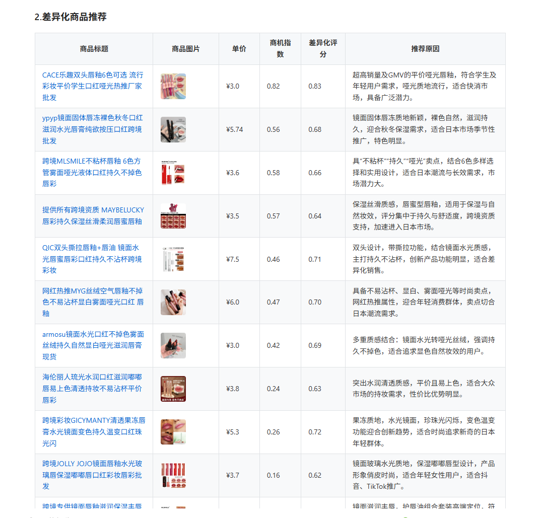 输入目标商品/类目(如唇釉,哑光,不沾杯持色,防水美 妆化妆品,持续保湿,商品主体+修饰词效果最好;也 可输入宠物用品、家居,尽量为小类目,避免商品输 出范围太大) | 推荐潜力商品,降低试错成本 |