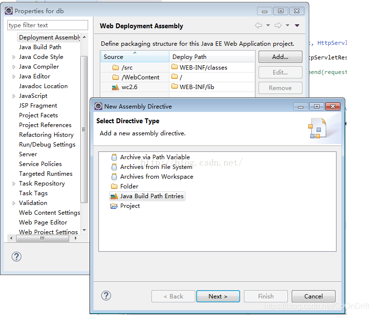 在eclipse集成tomcat开发web时,java类引入的jar包,编译通过,但启动tomcat运行web时提示找不到jar包内的类,需要作如下配置,将jar包在部署到集成的tomcat环境中。