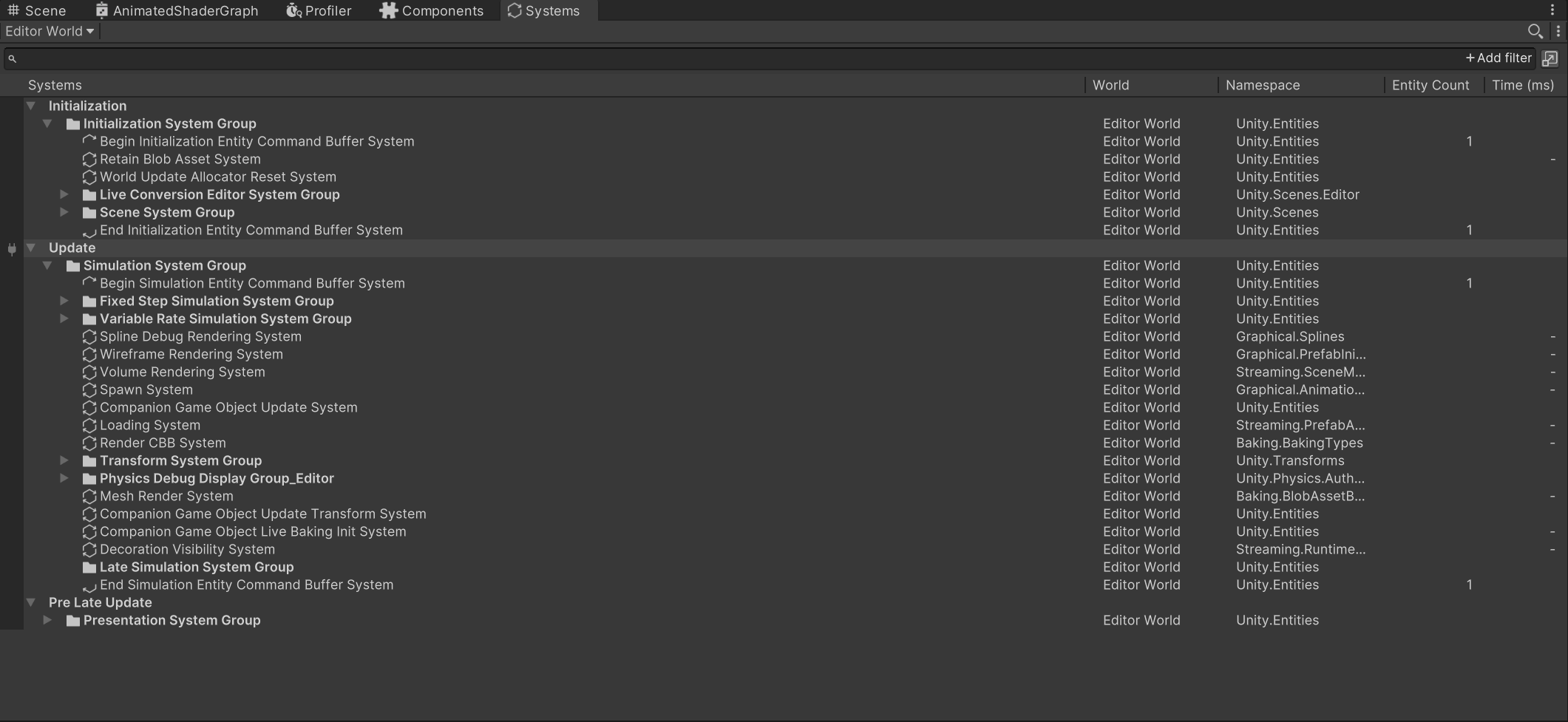 通过 System 窗口来看,一个 world 会被组织成多个 Syst