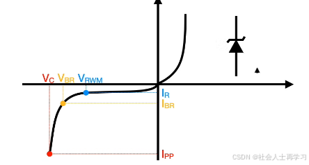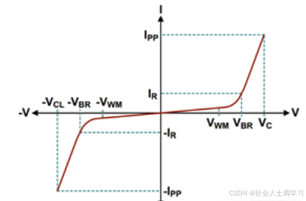 Vbr是反向击穿电压,当电路的电压大于Vbr,反向并联的TVS此时也近似短路,之前说的人体静电就可以从TVS管直接流向地,保护了我们后面的电路。Vbr对应的电流是反向击穿电流Ibr。