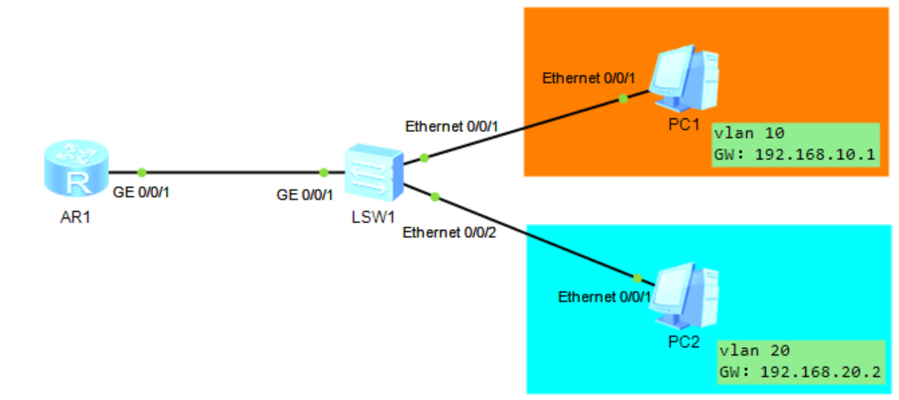 [LSW1-Ethernet0/0/2]port default vlan 20 #接口仅允许VLAN 20路由通过