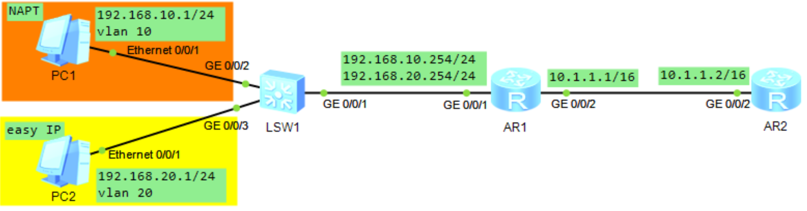 如图所示,配置NAPT与easy IP,实现PC1、PC2分别可以访问到AR2